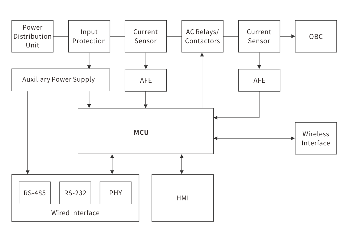 AC 충전소는 DC 충전기보다 본질적으로 간단하지만, 전력망에서 차량 내부로 교류 전류를 안전하게 전달합니다. 공간 및 무게 제약으로 인해 차량 탑재형 충전기와 AC 충전소 모두 일반적으로 낮은 전력 수준(22kW 이하)으로 제한되어 충전 시간이 길어지고, 종종 몇 시간이 걸립니다. 이러한 시스템은 차량 탑재형 충전기를 사용하여 전력망의 AC 전력을 직류로 변환하여 차량 배터리를 충전합니다. 충전기와 차량 모두의 안전을 보장하는 것이 매우 중요합니다.