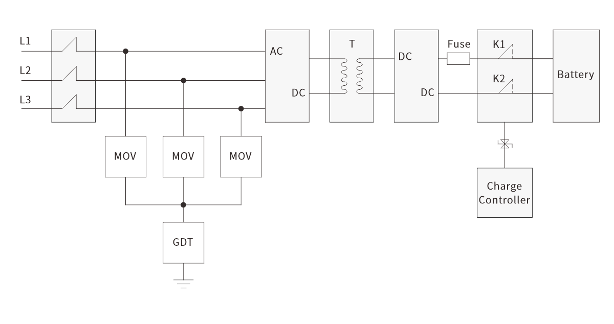 EV 온보드 충전기(OBC)는 작동 중 AC 전력망(AC 220V/380V)과 차량의 고전압 DC 배터리(DC 400V/800V)에 직접 연결됩니다. 따라서 낙뢰 서지, 스위칭 서지, 정전기 방전에 취약합니다. MOV와 GDT는 전력망의 전자파 간섭 및 전압 스파이크를 제거하는 데 필수적입니다.