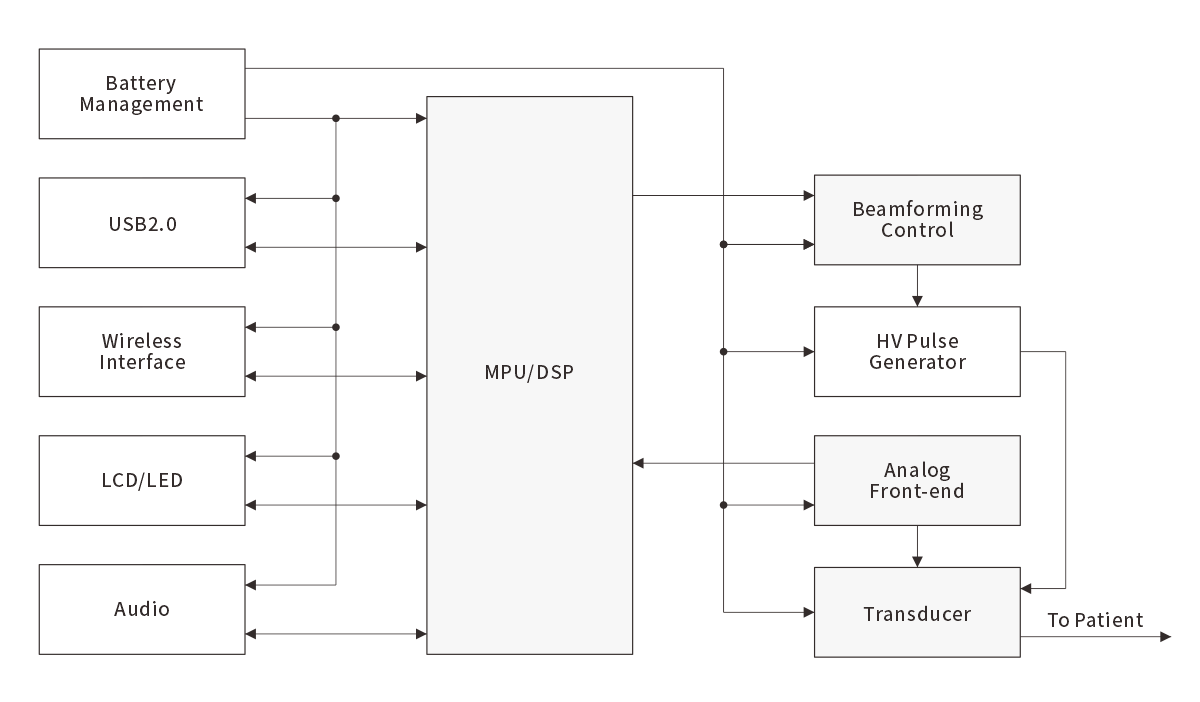 휴대용 초음파 스캐너는 응급실, 가정 간호실, 병원 등에서 진단 영상을 제공합니다. 이 다이어그램은 스캐너의 안전한 작동과 정확한 영상 생성을 보장하는 당사의 제품군을 보여줍니다. 당사의 솔루션에는 고전압 펄스 발생기로 사용되는 전계 효과 트랜지스터(FET), 고속 복구 다이오드, 그리고 다양한 유형의 회로 보호 장치가 포함됩니다.