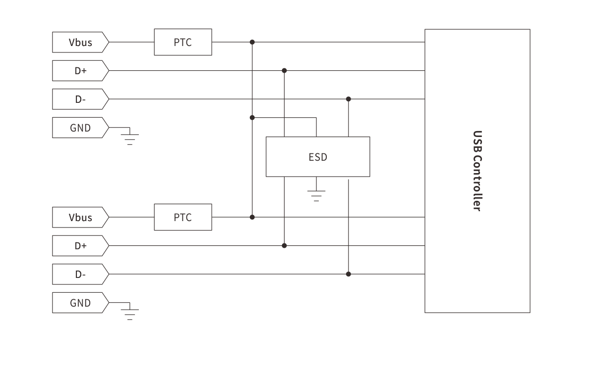 The ESD Protection solution for dual USB 2.0 interfaces aims to prevent damage to USB data and power lines caused by interference signals such as electrostatic discharge (ESD), electrical fast transients (EFT), and surges, thereby ensuring interface reliability and system stability.